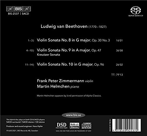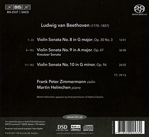 Previous instalments of the Beethoven sonata cycle from Frank Peter Zimmermann and Martin Helmchen have met with wide acclaim. Described as ‘conversations by a perfect instrumental pairing’ in BBC Music Magazine, the discs have received a Choc in Classica and the recommendation of German website klassik.com, respectively. This the third and final volume brings together Beethoven’s last three works in the genre, composed between 1801 and 1812. The centre-piece is the ninth sonata, the famed ‘Kreutzer Sonata’. The title page of the first edition described the sonata as ‘written in a highly concertante style’ and it does indeed surpass everything that had previously been written in the genre, in terms of scale as well as technical and compositional complexity. It is preceded by the more lightweight Sonata No. 8 in G major, in which ideas and motifs chase each other until the end of the whirlwind finale. Also in G major, Beethoven’s tenth and final violin sonata closes the disc. It was composed almost ten years after the Kreutzer, and is certainly less spectacular. In no way is it a step backwards in artistic terms, however: exchanging drama and heroics with songful intimacy, it is rather one of the works through which Beethoven freed himself from the depression into which he had fallen after renouncing his ‘Immortal Beloved’.