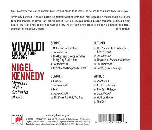 Die 1989 von Nigel Kennedy veröffentlichte Einspielung von Vivaldis Vier Jahreszeiten ist das meistverkaufte Klassik Album aller Zeiten. Jetzt wendet sich Kennedy demselben Werk abermals zu – mit einer völlig neuen Interpretation. Mit dem Orchestra of Life hat Kennedy eine rasante und einzigartige Bearbeitung des beliebten Werkes eingespielt. Rhythmus, Klang und Besetzung haben sich verändert und die Erweiterung um Singstimmen und Elektronik verleiht der Musik eine neue Dimension. Kennedy zeigt, dass die Vier Jahreszeiten eine universelle, vom Zeitgeist unabhängige Musik sind. Seiner Meinung nach gibt es keinen Grund, Vivaldis Meisterwerke nicht modernen Instrumenten oder Musikstilen zu öffnen, an die in Vivaldis barocker Welt noch gar nicht zu denken war. Die elektronischen Sounds von Damon Reece (Massive Attack), geben dem Werk einen einnehmenden, hypnotischen Puls. Das Orchestra of Life folgt allen Höhenflügen Kennedys Inspiration und ist gleichzeitig Garant dafür, dass seine Verbindung zu Vivaldis Vorlage niemals abreißt.