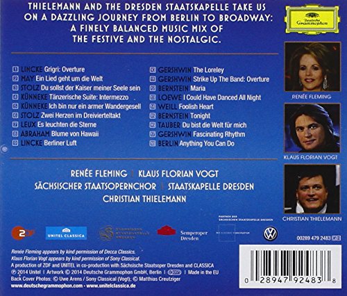 Christian Thielemann und die Staatskapelle Dresden spielen die schönsten Operetten-Hits von Paul Lincke, Eduard Künneke oder Richard Tauber. Dazu Evergreens aus Broadway-Musicals von George Gershwin und Leonard Bernstein. Die Solisten des Abends sind die Amerikanische Operndiva Renée Fleming und der Deutsche Tenor und ECHO-Klassik Preisträger Klaus Florian Vogt.