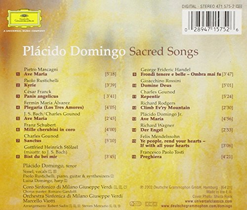 Demütig senkt der berühmte Tenor Placido Domingo auf dem Cover dieser CD den Blick: Sacred Songs, geistliche Lieder im weitesten Sinne, stehen auf seinem Programm. Domingo hat sich bei der Auswahl seines Repertoires aus drei Jahrhunderten Musikgeschichte bedient; es erklingen Werke von Johann Sebastian Bach und Georg Friedrich Händel bis hin zu Franz Schubert, Richard Wagner und Pietro Mascagni. Publikumsrenner die meisten, viele werden hier im verpopten Arrangement geboten, manche mit Synthesizer, kaum eines aber in seiner originalen Gestalt. Mit auf der Aufnahme auch eine Vertonung des “Ave Maria” von Plácido Domingo Junior. “In gewisser Hinsicht ist alle Musik geistlich”, rechtfertigt Domingo seine Auswahl, “denn es scheint als würde die aus einer göttlichen Sphäre zu uns gelangen”. Domingo wollte diese CD aufnehmen, weil er glaubte, dass “es im Leben aller Menschen Situationen gibt, in denen sie solche Musik hören möchten”.