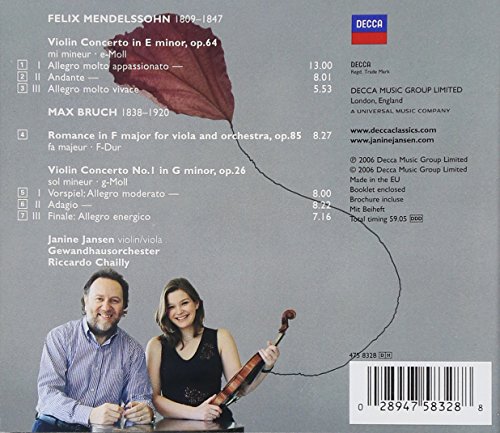 Vergleich erst führt zum Genuss: Musikkenner werden es zu schätzen wissen, wenn sie die Klassiker der Geigenliteratur, die Violinkonzerte von Felix Mendelssohn und Max Bruch, einmal nicht von Anne Sophie Mutter und Herbert von Karajan hören, sondern von einem der neuen Stars am Geigenhimmel. Die junge Holländerin JANINE JANSEN, das “Mädchen mit dem Perlmutt-Ton”, bürstet frisch und unbekümmert jeden Staub aus den beiden Schlachtrössern. Riccardo Chailly dirigiert (Decca). –Christine Claussen — Stern
