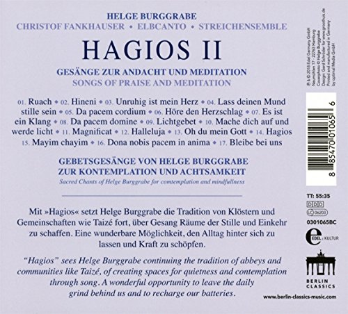 So weit meine persönliche Erinnerung reicht, höre ich die Stimme meiner Mutter. Die Lieder abends am Bett, über die ich einschlief, gaben Trost und klingende Geborgenheit, so erinnert sich Burggrabe. Mit Hagios II führt er seine Spurensuche nach der bewegenden Kraft des Gesangs fort. Dabei findet er Melodien, die schon Jahrhunderte alt sind. Er trifft auf Werke aus Mönchskulturen aller Glaubensrichtungen, die nach Ruhe und Frieden suchen und ihre Wurzeln in der antiken jüdischen Musik haben. Das gemeinsame Singen – auch Psalmodieren genannt – findet sich in gregorianischen Chorälen, der orthodoxen Liturgie, in Taizé-Gesängen und Gesängen der Gegenwart. Die Gesänge und klingenden Gebete wurden dabei stets als heilend und beruhigend wahrgenommen. Dies alles nimmt Helge Burggrabe auf und eröffnet einen Raum, der zum Nachdenken, Träumen und Innehalten einlädt.