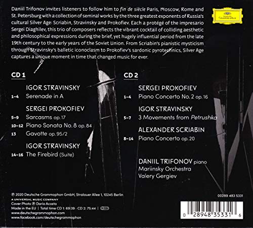 DANIIL TRIFONOV – SILVER AGE Daniil Trifonov würdigt eine Musik, die in einer entscheidenden Phase der russischen Geschichte geschaffen wurde. Sein neues Album Silver Age enthält Werke von Skrjabin, Strawinsky und Prokofjew Aufgenommen mit Valery Gergiev und dem Mariinski-Orchester Zu hören sind das Zweite Klavierkonzert und Solowerke von Prokofjew, Strawinskys Pétrouchka und L’Oiseau de feu sowie Skrjabins Klavierkonzert in fis-Moll Daniil Trifonovs neuestes Album, das mit Valery Gergiev und dem Mariinski-Orchester aufgenommen wurde, erinnert an eine Zeit, als russische Musiker, Dichter, bildende Künstler, Dramatiker und Interpreten zu den originellsten der Welt gehörten. Silver Age veranschaulicht die künstlerische Kühnheit und Brillanz einer turbulenten Epoche des Landes mit Werken seiner avantgardistischsten Komponisten. Trifonov spielt Skrjabins Klavierkonzert in fis-Moll op. 20, Prokofjews Klavierkonzert Nr. 2 in g-Moll op. 16 und Strawinskys Trois Mouvements de Pétrouchka. Hinzu kommen Strawinskys Sérénade und Auszüge aus seiner Klaviersuite von L’Oiseau de feu sowie von Prokofjew Sarcasmes op. 17, die Klaviersonate Nr. 8 in B-Dur op. 84 und die »Gavotte« aus Cinderella op. 95 Nr. 2. Das Programm des Pianisten fängt die auf Zukunft ausgerichtete, Regeln missachtende Energie wegweisender Werke von drei ungewöhnlich fähigen Komponisten ein. Es zeigt auch, wie typische Elemente des Silbernen Zeitalters, etwa Ironie und Interesse für Volkskultur oder Vorstellungen aus der Vergangenheit, in späteren Kompositionen von Prokofjew zutage treten, zum Beispiel in seiner Musik zu Cinderella und der Klaviersonate Nr. 8, Werken der Reifezeit, in denen er erneut den musikalischen Idealen nachgeht, die einst seinen Ruf als bilderstürmender junger Komponist und Pianist begründeten. Vor allem erfasst Trifonovs Auswahl die kreative Vielfalt dieses kurzen, aber explosiven kulturellen Augenblicks. »Skrjabin«, so Trifonov, »wollte alle ästhetische Erfahrung in einer einzigen, mystischen, musikalischen Vision zusammenfassen; Strawinsky vereinte die Künste durch eine radikale Neubestimmung des Balletts; und Prokofjew wandte sich dem Film als vollständiger, modernster Verbindung der Sinne zu.« Das russische Silberne Zeitalter bereitete den Weg für künftige künstlerische Entwicklungen, sein Geist wird zu Recht in dieser neuen Aufnahme gefeiert. »Das Silberne Zeitalter in der Geschichte der russischen Kunst steht nicht für eine bestimmte Ästhetik, sondern bezeichnet ein zunehmend zersplittertes soziales, politisches und intellektuelles Umfeld – eine Mischung von unterschiedlichen künstlerischen Äußerungen in erregter Interaktion.« Daniil Trifonov